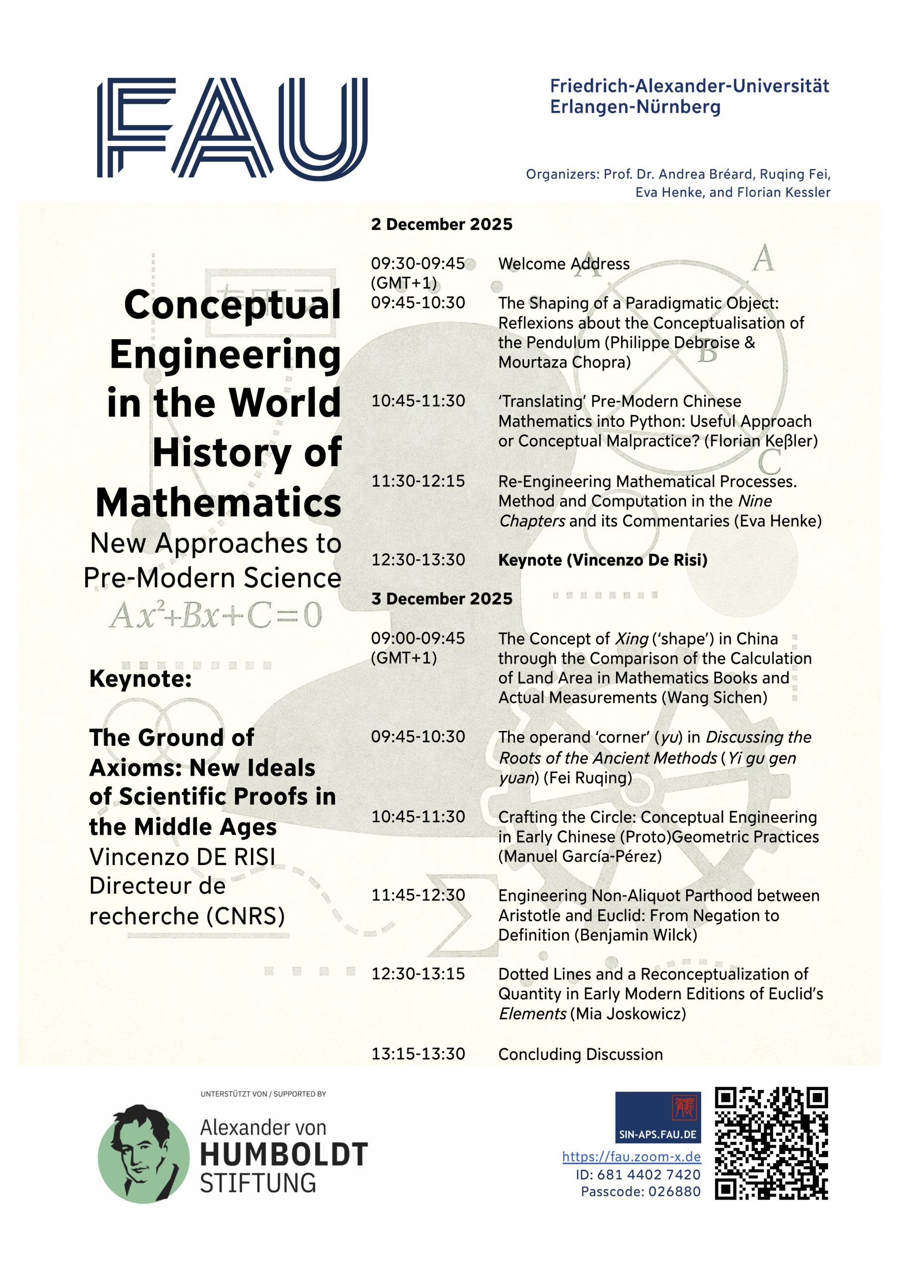 In this workshop, hosted by sin-aps and generously supported by the Alexander von Humboldt Foundation, we will approach the global pre-modern history of mathematical concepts in a new light. Dr. Vincenzo de Risi (CNRS, Paris) will give the keynote talk on The Ground of Axioms: New Ideals of Scientific Proofs in the Middle Ages.